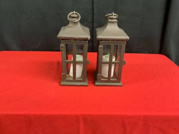 Beautiful set of metal lanterns the dimensions are L 5.5 in x W 5.5 in x H 14 in. Please contact michael at 805-286-5466. Emails go directly to spam. Mmsbtz
