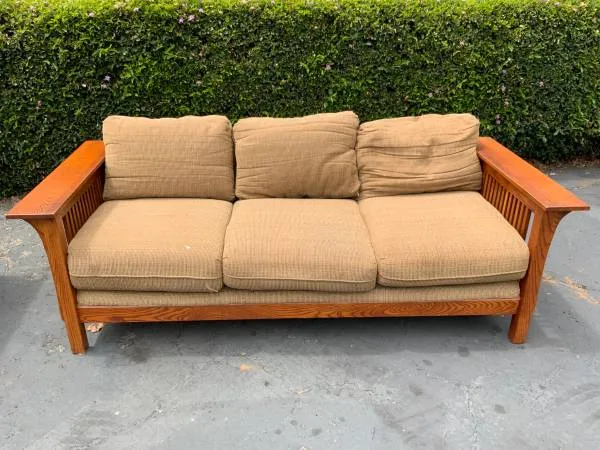 His couch and loveseat is solid wood with brown cushions. The couch is 87 x 37.5 x 30 with a seat h 8 of 20 inches loveseat is 62 x 37.5 x 30 with the seat h 8 of Please contact michael at 805-286-5466. Emails go directly to spam. Mmsbtz