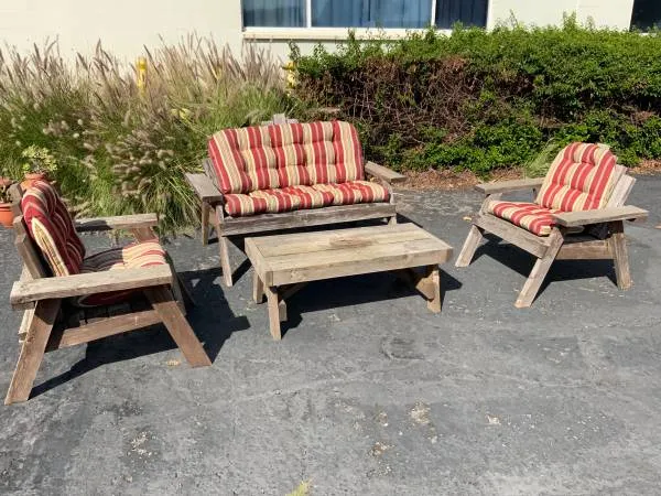 Tthis patio set is made solid wood Adirondack of 2 x 4 and 2 x 6 very solid and sturdy. The dimensions on the loveseat are 581/4 x 28 x 371/2 with a seat h 8 of 17 the dimensions on the chairs are 341/2 x 29 x 35 with the seat h 8 of 17 the coffee table is 43 x 191/2 x 16. The cushions are also in good condition no weathering no rips. Please contact Mike at 805-286-5466. Mmsbtz