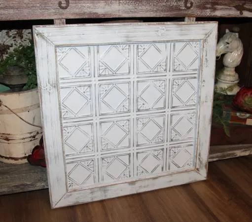 ⭐️ TONS of other shabby, vintage and farmhouse decor available now as well. Click on the “MORE ADS BY THIS USER” to see all there is currently posted. ⭐ $25.00 FIRM ⭐ PORCH PICK UP ONLY in West Edmond/N OKC ⭐ FCFS - NO HOLDS ⭐ ⭐ Venmo, Cash App or CASH at pick up Ornate 28 tall x 28 wide distressed white and pewter metal tile wall decor plaque with distressed white reclaimed wood frame. Great shabby, aged look! Hanging hardware attached at rear. Perfect vintage inspired piece for French Country, Shabby Chic or farmhouse cottage decor! ⭐️ Please CALL or TEXT 580.seven 0 four.5500 if interested in picking up ⭐️