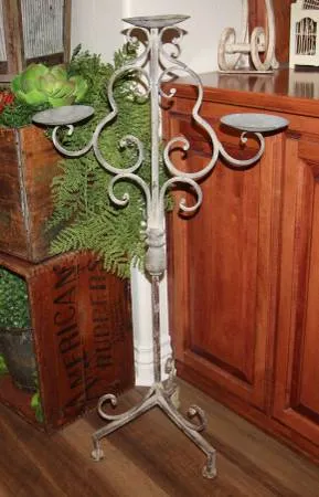 ⭐️ TONS of other shabby, vintage and farmhouse decor available now as well. Click on the “MORE ADS BY THIS USER” to see all there is currently posted. ⭐ $25.00 FIRM ⭐ PORCH PICK UP ONLY in West Edmond/N OKC ⭐ FCFS - NO HOLDS ⭐ ⭐ Venmo, Cash App or CASH at pick up LARGE ornate 38.5 tall x 20 wide x 11 deep through legs metal and iron floor height candleabra candle holder accommodating 3 pillar candles. Pretty distressed gray, off white and pops of rust patina with ornate scrolled details and a weathered stone texture for shabby, vintage charm! Perfect for Shabby, French Country or farmhouse cottage decor! ⭐️ Please CALL or TEXT 580.seven 0 four.5500 if interested in picking up ⭐️