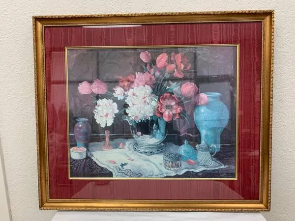 Luxuriously Framed with Glass Art Print of a Painting by Glenna Kurz Still Life of Flowers a Silver Bowl, a Blue Vase and Dresser Items Glenna Kurz was considered a Top 100 California artist before her death in 2014. Her work was widely distributed by the Bradford Exchange and other collectibles firms. Dimensions: Image: 27 3/8 x 22 1/4 Frame: 37 3/4 x 32 Excellent Condition Gold Edge Deep Red Satin Mat Re-papered Back, No original tags Dont miss this high-quality collectible art reproduction to add to your home decor. CASH ONLY - AFTER INSPECTION We will not respond to offers of other forms of payment, requests for shipment through third parties, requests for direct e-mails not through CL, and e-mails or texts that appear not to be legitimate. Call or text the contact shown above, 9:00 AM - 8:00 PM to see the item. WE DO NOT RESPOND TO E-MAILS THAT DO NOT INCLUDE A PHONE NUMBER.