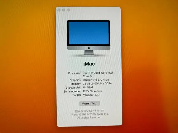 APPLE IMAC 27 RETINA 5 K A 1419 MID 2017 Normal working condition MAC INFO. Processor Intel Core i 5-75003.4 GHz Installed Hard Drive ------- 1 TB SATA DISK 2 nd Drive 28 GB Flash Installed Memory -------- 32 GB DDR 4 Screen Size 27 Reina 5 K with web cam Wi-Fi and Bluetooth connection Mac OS Ventura Version 13.7.4 NOTE, the computer has 1 small crack on the screen and small scratches on the body, also keyboard and mouse not included. For any info call or text 773-715-2289 FIRM PRICE.