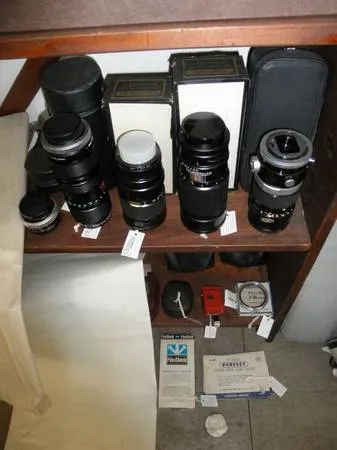 Canon 55-135 mm f 3.5 lens with hard case; Vivitar 75-205 mm f 3.8 lens, close focusing auto zoom with hard case; Bushnell 200 mm f 3.5 lens with soft case with box; Bushnell 55-135 mm f 3.5 lens to fit Nikon camera body; Cosmos CF auto teleplus 2 x adapter with hard case; Canon filter 58 mm with plastic case with box; used, 816-229-6500