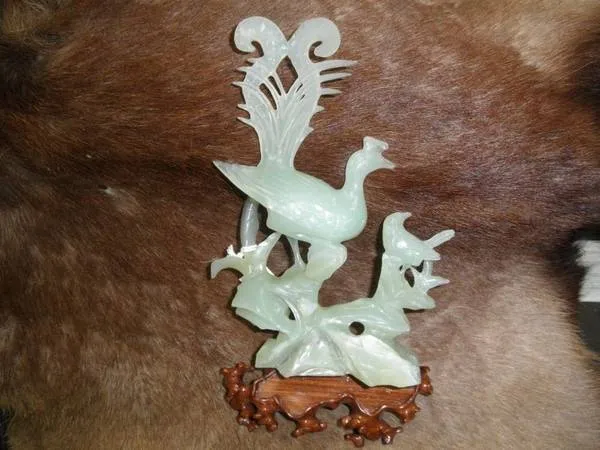 rare hand carved green jade, peacocks and birds, on hand carved wood bases 8 inch x 4 inch, h 88 inch, circa 1940, pair $1200, 816-229-6500