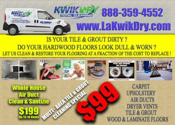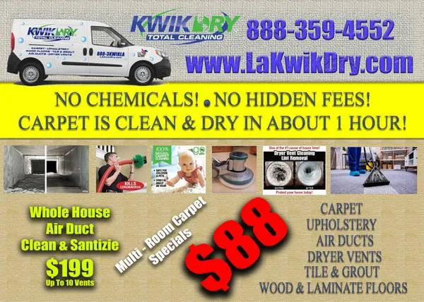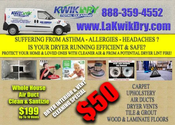 DRYER VENT - AIR DUCT - UPHOLSTERY - TILE & GROUT - CARPET FULL SERVICE DEEP CLEAN - SAMEDAY LOCAL CLEAN HOUSE CLEANING - OFFICE CLEANING.. https://hosting.photobucket.com/images/i/info 510/AIR_DUCTS_poster.jpg -----For Best Price and Quality just call us at---- 888-359-4552 www.lakwikdry.com --------------------------------------------- CARPET CLEANING - Go Green all natural cleaning solutionsno chemicals - Tough on Dirt & Stains - our all natural proprietary solutions clean, disinfect & sanitize - Not like traditional Steam Cleaning. Traditional steam cleaning uses up to 10 gallons of hot water, which saturates not only the carpet but the padding as well. This saturating process takes up to 3 days to fully dry & a lot of stains reappear due to Wicking - which occurs when stains in the padding are pulled back up to the fabric ends of the carpet, as the pad dries. With our process, we concentrate on cleaning the carpet itself without saturating it, using only about 1 gallon of water along with our all-natural proprietary cleaning solutions, which only takes about 1 hour to dry - not days. The finished results are often as good if not better than traditional steam cleaning - with no reoccurring stains. - Carpet is dry in about 1 hour AIR DUCT CLEANING Do you or your loved 1 s suffer from asthma, allergies or headaches? Dirty, clogged air ducts diminishes indoor air quality and could pose a threat to your health. Clean the air with a thorough duct cleaning, and enjoy a renewed home. - Remove, clean and re-attach air vent registers - Interior clean of all supply air ducts with a high powered rotating brush vacuum - Distribute a safe organic sanitizing mist throughout the air duct system, to help remove harmful microbials and bacteria - Clean & sanitize air handlerfurnace DRYER VENT CLEANING Does your dryer take a long time to dry your clothes? Did you know dryers are 1 of the leading causes of household fires? Save m 1 y today with a more efficient operating dryer & protect yourself & loved 1 s from a potential costly fire. - Thoroughly extract lint from dryer interior - Thoroughly clean out dryer vent line with high pressured air - eliminating lint build-up & clogs UPHOLSTERY CLEANING - Thorough vacuum to eliminate all loose dirt & soil - Clean & extract with our specialized equipment - Tough on Dirt & Stains - our all natural proprietary solutions clean, disinfect & sanitize MATTRESS CLEANING - Thorough vacuum to eliminate all loose dirt & soil - Clean & extract with our specialized equipment - Tough on Dirt & Stains - our all natural proprietary solutions clean, disinfect & sanitize TILE & GROUT CLEANING - Clean & extract built-up dirt on tile & grout lines - Our all natural proprietary solutions clean, disinfect & sanitize WOOD & LAMINATE FLOOR CLEANING Does your wood floor look worn & dull? Bring it back to life with our deep clean & re-coat process. - Buff floor with abrasive pad to remove old wax build-up & minor scratches - Deep clean floor with our all natural proprietary solution to remove embedded dirt - Apply 2 coats of our all natural proprietary sealer to leave your floor with a protective gloss finish ----------------------------------- KEY WORD..CITY & ZIP CODES kill coronavirus in your home - Oriental rug cleaner, steam cleaning. Upholstery cleaning, sofa cleaning, couch cleaning, scotch guard, dry cleaning, furniture cleaning, carpet steam cleaning, pet odor, spot removal, Oriental rug cleaning, steam cleaning. Upholstery cleaning, sofa cleaning, couch cleaning, scotch gaurd, dry cleaning, furniture cleaning, carpet steam cleaning, pet odor, spot removal, chair cleaning, pet friendly, green seal, go green, wax removal, gum removal, water extraction, water damage, wine stains, silk rug, turkish rug, truck mounted, portable, mattress cleaning, rv, auto, best carpet clean, chem dry, stanley steemer, coit, sears, carpet cleaning, carpet cleaners, upholstery cleaner, sofa cleaner, couch cleaner, steam cleaner, water removal, dry cleaner, truck mounted, burbank, glendale, van nuys, north hollywood, sherman oaks, encino, pasadena, hollywood, raeslers, niagra, l.a. carpet cleaner, steam cleaning deep cleaning deep carpet cleaning housekeeper housekeeping carpet cleaners carpet cleaning steam cleaning shampooing shampoo carpet cleaner carpet clean carpet care water damage carpets upholstery pet treatment real estate movers moving spring pet friendly allergen eco environmentally green air duct air ducts airduct airducts dryer vent dryervent dryer vents dryervents Baldwin Park 91706 Bell 90201 Bellflower 90706 We service all the cities in the Inland Empire area..... - RiversideRV- San BernardinoSB- FontanaSB- Moreno ValleyRV- Rancho CucamongaSB- OntarioSB- CoronaRV- VictorvilleSB- TemeculaRV- MurrietaRV- Banning - Beaumont - Blythe - Calimesa - Canyon Lake - Cathedral City - Coachella - Corona - Desert Hot Springs - Eastvale- Hemet - Indian Wells - Indio - Lake Elsinore - La Quinta - Moreno Valley - Murrieta - Norco - Palm Desert - Palm Springs - Perris - Rancho Mirage - Riverside - San Jacinto - Temecula - Wildomar - County of Los Angeles - Claremont - Pomona - County of San Bernardino - Adelanto - Angelus Oaks - Apple Valley - Barstow - Big Bear Lake - Bloomington - Chino - Chino Hills - Claremont - Colton - Crestline - Fontana - Grand Terrace - Hesperia - Highland - Lake - Arrowhead - Loma Linda - Lucerne Valley - Ment 1 - Montclair - Needles - Ontario - Rancho Cucamonga - Redlands - Rialto - Running Springs - San Bernardino - Twenty 9 Palms - Upland - Victorville - Wrigh 2 od - Yermo - Yucaipa - Yucca Valley -All Cities - Riverside - San Bernardino - Fontana - Moreno Valley - Rancho Cucamonga - Ontario -Corona - Victorville - Temecula - Murrieta 902109021190212 Burbank 9150191502915049150591506 Calabasas 91302 Canoga Park 9130391304 Canyon Country 9135191387 Carson 9074590746 Castaic 91384 Cerritos 90703 Chatsworth 91311 Compton 902209022190222 Covina 917229172391724 Culver City 