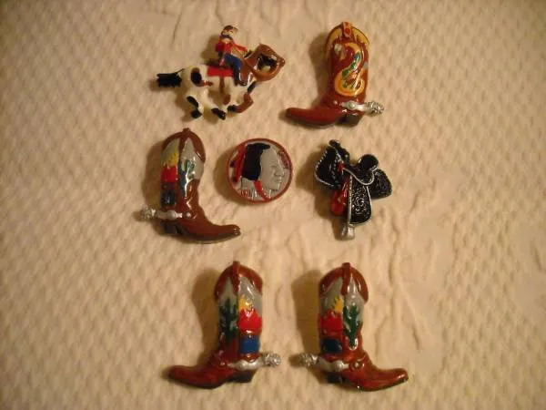 Country Western, Button Covers and Earrings Set - $205 Country Western, Button Covers - PLUS a pair of Cowboy Boot Earrings Vintage 1980 s Original owner. 949-492-7262 Landline Answering Machine on 24-7. No Caller ID. Must lv. your ph # w/area code, clearly, so I can return your call. Do not ask if the western, 7 piece set is still available. If you see it, I have it. The posting will be deleted the day the set is sold.