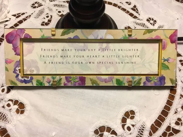 Pansy Flower Frame - $8 Oblong: 9 x 3 Pretty pansy flowers of purple and lavender on a pale yellow background. There is a Friendship Saying in the center. Nice if you want to give as a gift. The friendship saying can be removed and used for a small panoramic photo or art. The inside opening is: 71/8 x 16/8 The frame has a glass front and is held together with 4 gold clips. 949-492-7262 Landline Answering Machine on 24-7. No Caller ID. Must lv. your ph. # w/area code, cle...