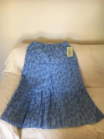 Blue Floral Boho Skirt, NWT - $20 Classic Elements. Size Medium. 100 Cotton. Machine washable. Excellent condition. New, never worn. 2 shades of blue flowers and small white flowers. If you want to keep the crinkle look, twist the skirt out of the washing machine and line dry. The skirt is lined 2/3 rds, from waist to knee level. 949-492-7262 Landline Answering Machine on 24-7. No Caller ID. Must lv. your ph # w/area code, clearly, so I can call you back. Do not ask if the skirt is...