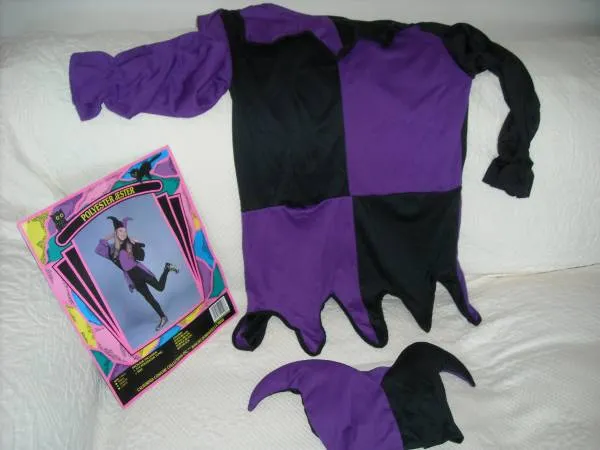 Jester Halloween Costume with hat - $8 Child Size. Purple and Black. Good condition. Worn once. 949-492-7262 Landline Answering Machine on 24-7. No Caller ID. Must lv. your ph. # w/area code, clearly. Do not ask if the Jester Costume is still available. If you see it, we have it. The posting will be deleted the day it is sold.