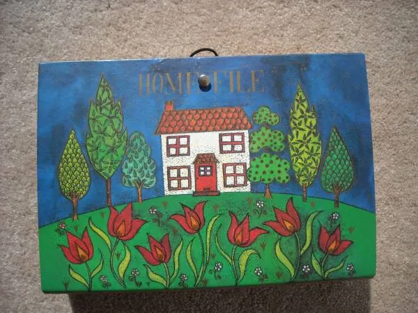 Decorative, Personal Home File - $1010 wide x 7 high x 2 deep at the bottom White house, Red tulips and green trees, on the cover HOME FILE is in gold bold letters on front, back and bottom. Excellent for coupons, monthly bills, greeting cards or any organized filing needs. Never used. Clean, no flaws. Pet free/Smoke free home. 949-492-7262. Must call and lv. your ph. # w/area code, clearly. Landline Answering Machine on 24-7. No Caller ID. Do not ask if the personal file i...