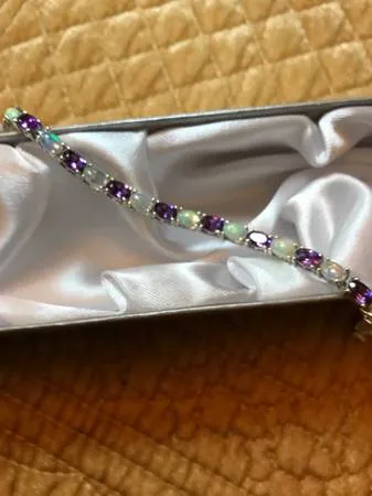 Brand new with tags in 🎁. GENUINE OPAL and AMETHYST tennis bracelet 10.10 ctw. Bracelet is 71/4 inches set in platinum over sterling silver. Price is absolutely firm. Reply to this ad or call 850-981-0119 My phone is a landline, won’t do texts, but has a voice answering machine.