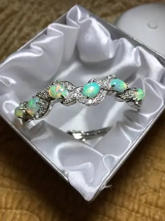 Brand New in gift box.Ethiopian Welo Opals with White Zircons Bangle Bracelet 6.00 ctwGenuine OpalsPlatinum over Sterling Silver . Adjustable length.Nice substantial w 8. Price is $195 and is FIRM. This is a close out price. Will not go lower. Reply to this ad or call 850-981-0119. This is a landline phone, can’t do texts, has a voice answering machine. I live in Milton.