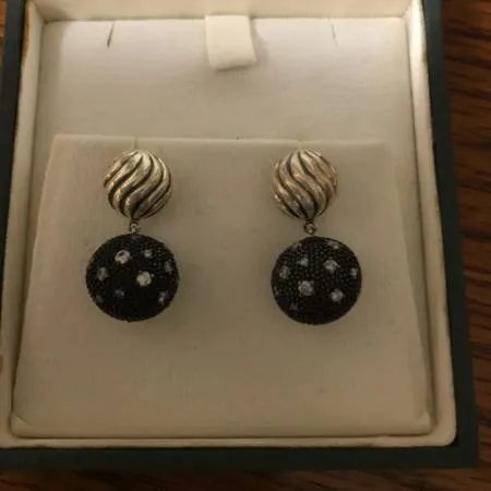 David Yurman vintage black sterling silver Diamond Midnight Melange Ball Drop Earrings.Good Vintage condition. Stamped 925, hallmarked “ D.Y. “ in gift box with David Yurman authenticity paper. Look on E-Bay. 1 seller is asking $1,199 and another 1 asking $1,092.50. I will sell for $ 500 or possibly trade for yellow gold necklace or bracelet men’s or women’ssolid gold.Reply to this ad or call 850-981-0119. I am in Milton Fl.