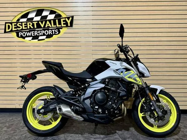Desert Valley Powersports Ask for: Sales Department ☎ (509) 786-0260 325 Merlot Drive Prosser, WA 99350 Enter this to see more images plus all other inventory we have available: http://lyv.cc/4UYJF 2023 CFMoto 650NK Price: $5,499.00 Basic Information: Year: 2023 Make: CFMOTO Model: 650 Trim: NK Stock Number: 000340 VIN: LCEPEVLB9P6000340 Condition: New Type: Standard Title: Clean Color: White Engine: Fuel Type: Gasoline Bore (in): 3.3 Bore (mm): 83 Carburetion Brand: Bosch Carburetion Type: Fuel Injected Cooling System: Liquid Cylinders: 2 Engine Disp. to Weight (cc): 1.43 Engine Size (cc): 649 Engine Size (ci): 39.6 Engine Stroke: 4-Stroke Engine Type: Parallel Twin Fuel Capacity (gal): 4.5 Fuel Injector Fuel Requirements: Regular Horsepower: 60 Horsepower (kW): 44.8 Horsepower RPM: 8750 Starter: Electric Stroke (in): 2.3 Stroke (mm): 60 Torque (Ft Lbs): 41.3 Torque (Nm): 56 Torque RPM: 7000 Valve Configuration: DOHC Valves: 8 Valves Per Cylinder: 4 Brakes: ABS Brakes Brake Brand Name: J.Juan Front Brake: Dual Hydraulic Disc Front Brake Diameter (in): 11.8 Front Brake Diameter (mm): 300 Rear Brake: Hydraulic Disc Rear Brake Diameter (in): 9.4 Rear Brake Diameter (mm): 240 Chassis & Suspension: Frame: Steel Front Suspension Brand Name: KYB Front Suspension Type: Telescopic Fork Number Rear Shock Absorbers: 1 Rear Adjustable Rebound Damping Rear Adjustable Shock / Spring Pre-Load Rear Suspension Brand Name: KYB Rear Suspension Material: Aluminum Rear Suspension Type: Twin Sided Swing Arm Comfort: Digital Instrumentation Trip Odometer Drivetrain: Number Of Speeds: 6 Primary Drive (Rear Wheel): Chain Transmission: Manual Other Information: Chain Guard Detachable Passenger Seat Exhaust Guard Exterior Covers Exterior Guards Foot Pegs Foot Peg Location: Driver and Passenger Front Fender Hand Grips Rear Fender Stand Stand Type: Kick Safety: Headlight Type: LED Fuel Level Warning Rearview Mirrors Temperature Warning Temperature Warning Type: Gauge Specifications: Body Material: Plastic Front Tire (Full Spec): Pirelli Angle GT 120/70 X 17 Front Tire (Inches): 17 Front Tire Aspect Ratio: 70 Front Tire Width: 120 Front Wheel Width (in): 3.5 Fuel Capacity (liters): 17 Height (inches): 39 Height (mm): 990.6 Length (inches): 83 Length (mm): 2108.2 Rear Tire (Full Spec): Pirelli Angle GT 160/60 X 17 Rear Tire (Inches): 17 Rear Tire Aspect Ratio: 60 Rear Tire Width: 160 Rear Wheel Width (in): 4.5 Seat Height (inches): 30 Tube / Tubeless: Tubeless Wet Weight (kg): 205.9 Wet Weight (lbs): 454 Wheelbase (in): 56.1 Wheelbase (mm): 1424.9 Wheels Composition: Aluminum Width (inches): 32 Width (mm): 812.8 Speedometer Tachometer Description: *Price does not include factory freight, dealer setup, applicable tax, license, and negotiable document fee*REBATE CAN NOT BE COMBINED WITH FINANCE OFFER.HURRY, OFFER ENDS 10/31/2024 2023 CFMoto 650NK The 650NK gives you everything you’re looking for in a midsize motorcycle—modern styling, great comfort, and refined performance. This motorcycle is a pleasure to ride all day long. The meticulously engineered 649cc parallel twin keeps giving. And thanks to the sport-tuned suspension, you can keep taking all the curves you want. With this motorcycle it’s time to take your riding ability to a new level. Features may include: Carving corners requires attention to detail that doesn’t cut any corners. We started with a great foundation—a rigid, high-carbon steel frame. Housed in the belly of the beast is a 649cc engine paired with a buttery smooth 6-speed gearbox. A slipper clutch is a great friend to those who enjoy aggressive downshifts. Top-shelf J.Juan brakes and Pirelli Angel GT tires hint at the level of rider you have the potential to be. TFT Display The 650NK features a large, 5-inch TFT display. Bright sunshine? You’ll have no issues with glare. Overcast skies? Screen brightness adjusts automatically. The full-color LCD instrument display delivers at-a-glance information, including rpm, gear, speed, even phone connectivity. Two interfaces differentiate your riding modes. Pirelli Tires The Pirelli Angel GT was chosen for its excellent feel, high degree of stability, and excellent wear characteristics. What’s more, it performs superbly in cold and wet conditions. This is your racetrack-capable sport touring tire perfectly capable on any paved road you have in mind. CF-SC Slipper Clutch Downshift as you enter a corner. Upshift, and accelerate as you exit. The slipper clutch makes the transition seamless. When downshifting from higher speeds, the slipper clutch reduces engine braking force. Engine speed quickly matches motorcycle speed—no need to worry about rear wheel hop. Engine Power is central to your riding experience. And 60 horsepower makes the 650NK the middleweight champion. The 649cc parallel twin is a DOHC, 4-valve per cylinder design. Liquid cooling keeps engine temperatures where they should for optimal performance. BOSCH EFI System BOSCH is one of the world’s most respected names in electronic fuel injection. The BOSCH EFI system chosen for the 650NK contributes to effortless riding. Enjoy quick starts at lower temperatures, instant throttle response, lower emissions, and excellent fuel consumption. Semi-Dry Sump The semi-dry sump provides the bike with continuous lubrication. The engine is never starved of oil at those critical times when lubrication is so critical. At 8750 rpm, your engine will be screaming with joy, not pain. LED Lights See and be seen. You’re not just lighting the road. You’re a beacon of light for others to see. The bike’s LED headlights provide optimum visibility and a clean aesthetic. KYB Suspension Components If you’re keen on leaning into corners, you’ll be happy to hear about this suspension. We paired a KYB telescopic fork with a KYB rear monoshock for performance that’s highly responsive to rider input. J.Juan Brake System Great brakes make you a better rider and inspire more confidence. That’s why w