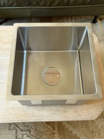 The Kohler Strive K-5287-NA Bar Sink is a modern and stylish addition to any kitchen. Made of durable stainless steel with a sleek silver color, this undermount basin sink is both functional and aesthetically pleasing. With dimensions of 15 inches in length and width, and 9 inches in height, this sink is designed for convenience and easy cleaning. The assembly is not required, making installation a breeze. Create a cohesive and contemporary look in your kitchen with this high-quality Kohler sink. It comes with a 6447- ST bottom basin rack. The rack is unopened and the sink is not in its original box but still brand new and never used.
