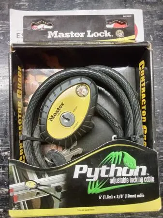 New Python Adjustable Locking Cable by Master Lock. This is 6 in length and 3/8 in diameter, it is cut resistant braided steel cable and ABS coated to protect against scratching, it has a rust resistant lock body and cable. Never out of package, these are $50 plus $7 shipping on eBay. $20 call Steve 412-835-7029.