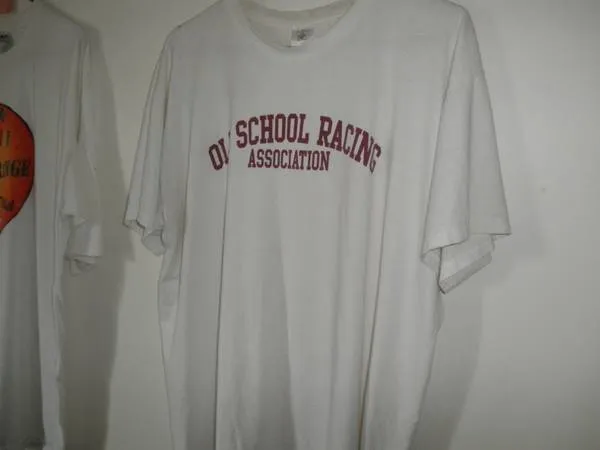 short sleeve, heavy material, 2 neck tags intact, white with red graphics old school racing association, used, Rich 816-229-6500