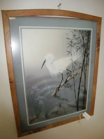 white snowy egret on fallen log in stream with bamboo trees and blue and green lotus flowers in fog, 21 inch high x 17 inch wide, faux blue and white matt, brown slat wood frame, circa 1988, Rich 816-229-6500