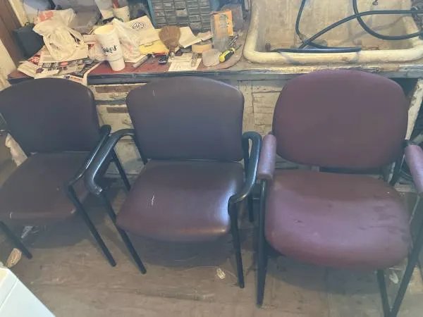 3 arm chairs 2 do match 1 is cloth and 2 are vinyl call Scott at 402-466-6252 thanks some have slight tears. Use them for the garage or extra chair outside or basement