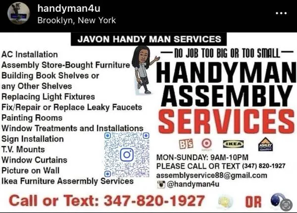 ON CALL 7 DAYS A WEEK SAME DAY SERVICES @HANDYMAN 4 U Good Day !! .👨🏾🔧Professional Grade Handyman📞 Call or Txt or WhatsApp 347-820-1927 for Expert Furniture Assembly and Installation Services . Services Provided ⬇️ •Home - Office - Kitchen •Office Furniture Assembly •Wire Concealment #PAXWardrobes Specialist •Kitchen Cabinets Installation •IKEA Product Assembly #TVMounting •Shelves •Door Hinges/Lock/Doorknob •Curtains, Blinds, Drapes •A/C Bracket/Installation •Light Fixture Replacement/Installation •Hanging of Mirrors, Plants, & Ar 2 rk •Dry Wall Repair for Holes/Water Damage •Painting Indoor/Outdoor •Staining Indoor/Outdoor •Exercise Equipment AssemblyBike, Elliptical, Tonal system etc •Outdoor #Furniture Lawn & Garden AssemblyGazebo, Swing Set, Basketball sets etc • Concrete repair •Shower Head Install/Replacement •Towel Bar Installation •Wood and Metal Repair, •Minor Cracks/Holes Repair •Light switches •Dimmers •Power Outlets •Outdoor Light Fixtures •Alarm System •Surround Sound Mounting •Track Lights •Chandeliers •Wall Units •Bookcase •Tile repair •Faucet and Sink replacement installation •Caulking and Grout •Shower Stalls •Bath Tubs •Toilet Bowls ✨ . YOU MUST BUY ANYTHING THAT IS NEEDED TO GET THE JOB D 1 ie: TV Mounting Service. You the client are responsible for purchasing tv mount prior to my arrival. If unsure the client can always consult me on which mount to purchase. . Check out my website and portfolios available on IG: handyman 4 u FB: www.facebook.com/assemblyservice When sending a text for an actual quote please include your area, make brand and picture of the furniture, list of things you’d like performed, your direct contact info, and the 2 date/timesthat you are best suited to have the services d 1. 🛠 Thank you in advance. @HandyMan 4 U Best Prices NegotiableWe work with your budget Good Deals Quality Work H 1 st and Reliable Affordable Handyman / Appliance Installation / Appliance Repair & Maintenance / Art hanging / Assembly of more suitable furniture / Attic Maintenance / Baby Proofing / Baseboard Molding Installation / Basement Finishing / Basement Flooring / Basement Remodeling / Bathroom Remodel / Bathroom Remodeling & Renovation / Junk Removal / Garbage Removal / Trash Removal / Bathroom Repair / Bathtub Refinishing / Bed Frame Assembly / Bike Assembly / Blackboard Installation / Blind Installation / Bookcase Assembly / Brick or St 1 Driveway Repair / Cabinet Assembly / Cabinet Installation & Repair / Carpenters / Carpet / Ceiling Fan Installation & Replacement / Ceiling Fan Repair / Central Vacuum Installation / Central Vacuum Repair & Maintenance / Ceramic Tile Flooring / Cheap Handyman / Childproofing / Clogged Toilet / Closet Storage Installation / Countertop Installation & Repair / Crown Molding & Trim Painting / Crown Molding Installation & Repair / Curtain Installation / Custom Cabinets & Mantels / Custom Shelving & Bookcases / Deck & Patio Repair / Deck Furniture Assembly / Deck Staining, Painting & Finishing / Decorative Hardware Installation / De-icing / Desk Assembly / Dimmers, Timers & Motion Detectors / Door / Door Installation / Door Painting / Door Repair / lock Installation / Drain Cleaning / Drain Unclogging / Drapery Installation / Dryer Vent Cleaning / Dryer Vent Installation / Drywall Installation / Drywall Repair & Finishing / Electrical Repair / Emergency Plumber / Entertainment Center Assembly / Exterior Door Installation / Exterior Door Replacement / Faucet & Showerhead Installation / Faucet Repair & Installation / Fence Repair / Fence Installation / Fence and Outdoor Structure Painting / Fence Assembly / Firewood Chopping / Fix Leaking Toilet / Flooring Installation / Flooring Repair / Frozen Pipe Repair / Furniture Assembly / Furniture Painting & Staining / Furniture Repair / Futon Assembly / Garage Door Opener Install / Garage Door Repair / Garage Flooring / Garbage Disposal Installation / Garbage Disposal Repair / Gazebo Assembly / General Contractor / General Labor / Grill Assembly / Grout Repair / Gutter & Downspout Repair / Gutter Cleaning / Gutter Guard Installation / Gutter Repair / Handrail & Stairs Installation / Handrail Repair / Handyman Services / Hanging Blinds, Curtains & Drapes / Hardwood Floor Installation / Hardwood Flooring / Holiday Lighting / Home Improvement / Home Maintenance / Home Remodeling / Home Window Repair / Hot Tub Installation / Hot Tub Repair / House Remodeling / IKEA™ Furniture Assembly / Installation of Grab Bars / Installation of guard and hand rails / Installing Tile backsplash / Interior Door Replacement / Interior Feature Painting / Interior Plastering / Kitchen Flooring / Kitchen Remodel & Renovation / kitchen Remodeling / Kitchen Repair / Laminate Floor Installation & Repairs / Laminate Flooring / Lath and Plaster Repair / Light Fixture Installation / Light Fixture Repair / Light Switch Replacement / Lighting & Electrical Fixtures Installation / Flood cameras Installation / Ring camera installation / Nest Thermostat Installation/ Loose Wall Switches & Socket Repair / Minor Plumbing Leaks / Moving light switches and electrical plugs / odd jobs / Outdoor Home Maintenance / Outdoor plumbing repair / Outdoor Structure Assembly / Outlet Replacement / Paint Removal / Patio Repair / Pavers Maintenance / Pergo Flooring / Pex Plumbing | Picture Hanging / Pipe Insulation / Playset Installation & Assembly / Power Wash Plumber / Plumbing / Plumbing Fixture Installation / Plumbing Fixtures / Plumbing Fixtures Repair / Plumbing Repair / Plumbing Snake / Polished Plastering / Pool & Spa Cleaning / Pool Winterization / Popcorn Ceiling Removal / Porcelain Tub Repair / Power Washing Services / Pump repair / Railing Installation / Raising of the toilet seats / Ramp Installation / Replacing cabinet and door handles / Roof Flashing / Roof Repair / Roofing Vent / Rubber Flooring / Screen Door Repair / Septic Tank Pumping