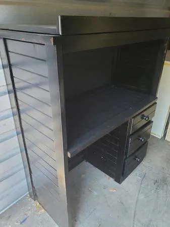 3-Drawer,Combination Desk-TV Stand,Dresser,Bulletin Board,Solid Wood. $35. 727-410-6758. 43 Wide, 20 deep and 51.5 tall. Top shelf can be a TV stand or place for a small organizer. The desk area is 38.5 wide, 18 deep and 18 high and enough for a monitor or laptop use. The back wall is a bulletin board. 3 drawers on right can be used for supply storage or clothes. All you need is your own chair. If you would like a commercial grade fluorescent light fixture to mount above the desk, I ...