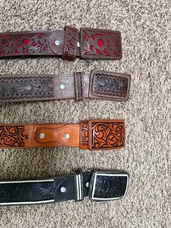 4 tooled leather belts each with a matching tooled leather buckle. Sizes 36-44. Asking $50 each obo. Cash only please. Email or text if interested 505-585-5453. 1. Brown with red floral inlay – Large flower and leaf tooling with red background fill. 2. Medium brown floral – Dark brown tooling on a lighter brown base with scalloped border. 3. Tan with black scrollwork – Bright tan leather with bold black scroll tooling. 4. Black with white stitching – Black leather floral tooling wi...