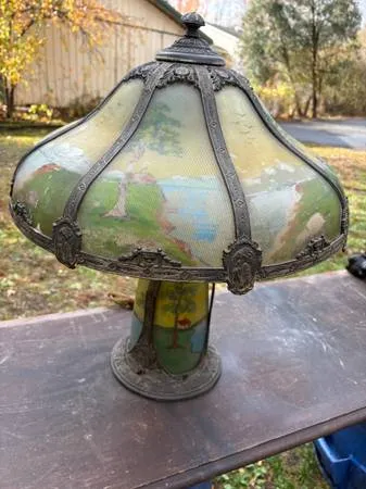 Shade diameter is 20.Stands 21.1 broken panel but piece is intact.Call or text 609-915-6997 to purchase or if interested in other antique lamps.