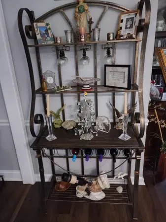 Decorative metal and wood shelf unit with wine rack and display spacedecorative items NOT included. Rack is about 35.75 long, 17 deep 6 high. Cash and carry/pick up only. If post is up its available so please dont ask that question. Cash only, first come, first serve. Call us @ 770-779-9088 then press # when prompted. Since this is a land line it can not receive any texts. Please leave message if no answer. Thanks