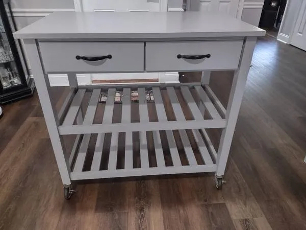 Gray kitchen island cart with 2 drawers and shelves, on locking wheels. 38 long, 22 deep, 36 hight Cash and carry/pick up only. If post is up its available so please dont ask that question. Cash only, first come, first serve. Call us @ 770-779-9088 then press # when prompted. Since this is a land line it can not receive any texts. Please leave message if no answer. Thanks