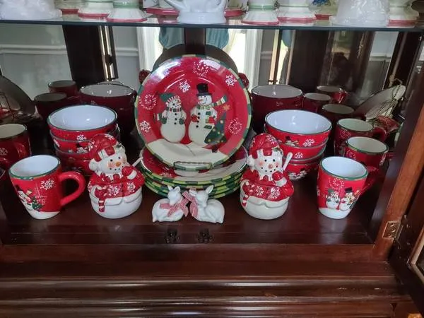Festive red dinnerware setting for 6 with a few spares featuring snowman designs Includes 6 plates, 7 dessert plates, 8 bowls, 6 mugs, 8 cheese spreaders and 2 jelly/sugar dish with spoon. Cash and carry/pick up only. If post is up its available so please dont ask that question. Cash only, first come, first serve. Call us @ 770-779-9088 then press # when prompted. Since this is a land line it can not receive any texts. Please leave message if no answer. Thanks