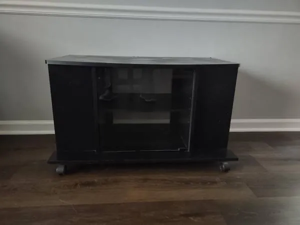 Black TV stand with glass door and adjustable shelves, on wheels, pressed wood. 35.5 long, 19.5 deep and 20.5 high Cash and carry/pick up only. If post is up its available so please dont ask that question. Cash only, first come, first serve. Call us @ 770-779-9088 then press # when prompted. Since this is a land line it can not receive any texts. Please leave message if no answer. Thanks