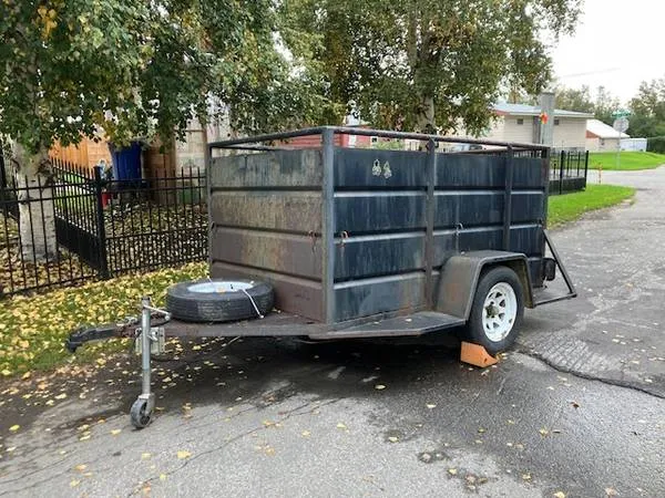 Super stout 12 foot long box trailer. Inside measures 96 long X 59 wide X 48 tall. Outside is 82 wide and 12 long. Drop down end ramp, 15 tires, hitch lock, jack and spare tire. $1000.00 Call 907-388-9943