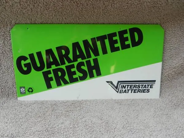 Interstate Batteries -Guaranteed Fresh Metal Sign-Offical NFL Sponsor , 221/2 X 111/2 ***Metel Double Sided Sign. I have 2 for sale. $100 Cash each or best cash offer. ****** Good Condition, Call 864-423-9600. If no answer, leave a message, I will return all messages.