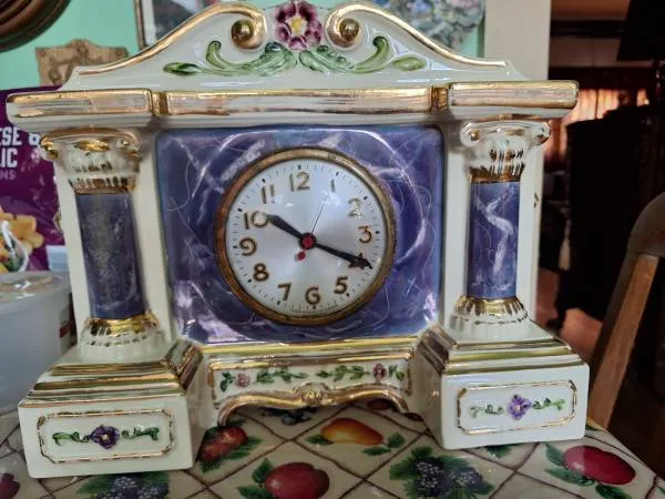 American-Beauti Clock gold plated. Vintage 1940 s 1950 s. Electric with original cord. Porcelain body with gold highlights. Keeps excellent time. 12 wide, 10 high, 4.5 deep. Excellent conditon for its age. Cash only, pickup only in Robbinsdale, MN. Give me a call, 763-535-6662, landline. If you choose to message me, I will send you my landline phone number. Please call with all questions. NO ENDLESS EMAILS. I will not ship this item. code word: schmedlapp