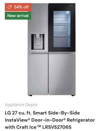 Scratch and Dent Key Specs Color Finish Stainless steel Product H 8 701/2 inches Product Width 357/8 inches H 8 To Top Of RefrigeratorWithout Hinges 687/8 inches H 8 To Top Of Door Hinge 701/2 inches Depth Without Handle 337/16 inches Depth With Handle 337/16 inches Total Capacity 27.1 cubic feet Refrigerator Style Side-by-Side Lighting Type LED Ice Maker Yes App Compatible Yes Works With Amazon Alexa, Google Home Voice Assistant Built-in No General Brand LG Model Number LRSOS 2706 S Product Name 27.1 Cu. Ft. Side-by-Side Smart Refrigerator with Craft Ice Color Stainless Steel Color Finish Stainless steel Side Panel Color Light Silver Dimensions Product H 8 701/2 inches Product Width 357/8 inches Product Depth 331/2 inches H 8 To Top Of RefrigeratorWithout Hinges 687/8 inches H 8 To Top Of Door Hinge 701/2 inches Standardized Width 36 inches Counter Depth No Depth Without Handle 337/16 inches Depth With Handle 337/16 inches Depth Without Door 291/8 inches Depth With Door 90 Degrees Open 511/8 inches Product W 8 295.6 pounds Cut-Out Dimensions Cut-Out H 8 711/2 inches Cut-Out Width 36 inches Cut-Out Depth 351/2 inches Capacity Total Capacity 27.1 cubic feet Refrigerator Capacity 17.5 cubic feet Freezer Capacity 9.6 cubic feet Performance Minimum Operating Temperature 55 degrees fahrenheit Maximum Operating Temperature 110 degrees fahrenheit Features Configuration Freestanding Panel Ready No Refrigerator Style Side-by-Side Fingerprint Resistant Yes Convertible Temperature Z 1 No Garage Ready No Dual Evaporation No Door-Open Alarm Yes Sabbath Mode Yes Temperature Control Type Electronic Display Type LED Defrost Type Automatic Hinge Setting Fixed left, Fixed right Lighting Type LED Wireless Connectivity Wi-Fi Ice & Water Ice Maker Yes Secondary Ice Maker Yes Ice Maker Locations Freezer Ice Dispenser Ice Form Cubed, Crushed Daily Ice Production 3 pounds Ice Maker Ice Form Round, Cubed Ice and Water Dispenser Ice and water Ice and Water Dispenser Location External Dispensed Water Type Cold Water Dispenser Features Dispenser control lock-out, Dispenser light, Ultraviolet disinfecting Storage Number of External Doors/Drawers 2 Number of Refrigerator Shelves 4 Refrigerator Shelf Style Adjustable, Fixed, Removable, Slide-In, Spill proof Quick Access Door Yes Dairy Center No Gallon Door Storage Yes Humidity-Controlled Crisper Yes Deli Meat Drawer No Refrigerator Shelf Material Tempered Glass Freezer Info Freezer Compartment Yes Freezer Location Left Freezer Door Type Swing Door Freezer Shelf Material Tempered Glass Freezer Interior Light Yes Quick Freeze No Filter Info Water Filtration Yes Water Filter Model Number LT 1000 P Air Filter No Electrical Specification Amperage 15 amperes Voltage 115 volts Estimated Annual Electricity Use 694 kilowatt hours Estimated Annual Operating Cost 83 United States dollars Certifications Listings & Approvals ENERGY STAR Certified Yes ADA Compliant Yes Consortium for Energy EfficiencyCEERating CEE Not Qualified Chemical Disclosures This product does not contain PFAS. For more information about PFAS chemicals in this product, visit https://www.lg.com/us/cookware-chemical-compliance-information. Este product no contiene PFAS. Para más información sobre químicas PFAS en este producto, visite https://www.lg.com/us/cookware-chemical-compliance-information. Warranty Warranty - Parts 1 Year General, 5 Years Sealed System, 5 Years Compressor, 10 Years Linear Compressor Warranty - Labor 1 Year General, 5 Years Sealed System, 5 Years Compressor Compatibility App Compatible Yes Works With Amazon Alexa, Google Home Voice Assistant Built-in No Call For More Information 651-454-5995 8980 Jefferson Trail West Inver Grove H 8 s, MN 55077 Appliance Depot Financing Available New, Scratch & Dent, and Reconditi 1 d Appliances/Parts Family Owned and Operated Since 1955 We Carry Most Major Brands Delivery, Installation and Service Available https://www.appliancedepot.com/ https://www.facebook.com/ApplianceDepotMN/ https://www.bbb.org/minnesota/business-reviews/appliances-major-dealers/appliance-depot-inc-in-inver-grove-h 8 s-mn-96007210 Showroom Hours: Monday - Friday 8:00 am - 6:00 pm Saturday 10:00 am - 5:00 pm Parts: M-F 8 AM – 4:30 PM Sat 10 AM-3 PM Recycling: M-F 8 AM – 4:30 PM Sat 10 AM-3 PM Other items we carry: aga, 5 star, speed queen, stackable, dishwasher, goodman, wall oven