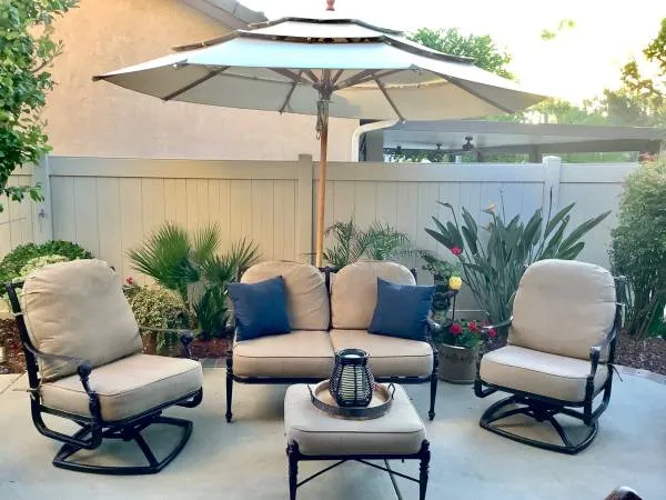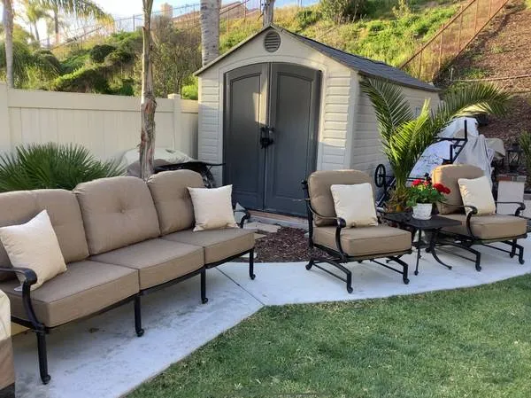 Still available don’t ask and price is firm. Buy new for $7000. All beautiful condition. Furniture by commercial quality grade by Gensun. Grand Terrace collection. Gensun loveseat with Sunbrella cushions 2 Gensun club lounge swivel rockers with Sunbrella cushions Gensun ottoman with Sunbrella cushions. All unzip for easy washing. Delivery available When ready to purchase…. Then call 714-904-1573. No scammers, no emails, no shoppers. Serious buyers only. Click on more ads by user under map for more patio listings.👍