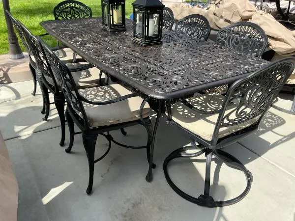 If you’re looking to invest in top of the line patio furniture Hanamint will last forever. Original price $6800. This is the Tuscany collection. All beautiful original condition. 90 x 42 Hanamint Tuscany dining table 8 Hanamint Tuscany dining chairs cushions sold separately Delivery available Serious buyers only call 714-904-1573. Call only when ready to purchase. No shoppers. No emails and no scammers.
