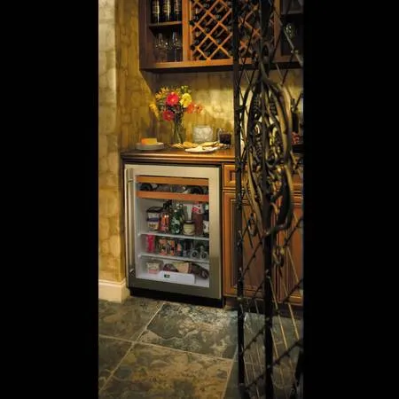 U-Line Origins Series 1175 BEVS 01. 24 Inch Beverage Center with Dual Cooling Z 1 s, 2 Beech-Trimmed Slide out Wine Racksup 16 Bottles of 3/4 liter, 2 Glass Shelves, Touch Pad Digital Controls and Tinted Thermal Glass Door: Stainless Steel/Left-Hand Hinge. Black Cabinet. Designed to accommodate a variety of different sizes and types of beverages as well as food items. Push button digital control in the lower shelf w/ multiple temperature z 1 s. 24 wide 25 depth 35 high. 6.0 Cu. Ft. Auto Defrost. $625 Calls Only 314-477-5061