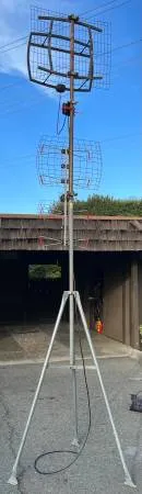 Price firm, no offers, please. I only answer people who want to buy all of the items for $80. If you see this ad everything is available so please don’t ask because I will not answer. However, you may contact me for a free telephone consultation. The 25-foot joined masts in the photos, the tripod mount, and the sandbags are not included. The bundle now includes your choice of a used 7.5-ft pipe and 2 others of different lengths. If you need it I will include a used clamp to attach guy wires. I have a fancy, new guy wire clamp for $15. I have a new, in box 3 ft tripod mount for $50. If you need it, I will also include free hardware for mounting the mast on a large diameter polewood?or other pipes or masts that are larger diameter than the included mast. An interested buyer wanted to know the cost of just a tripod mount and a mast. This is the lowest cost I found on Amazon with a short mast: https://www.amazon.com/Antenna-Tripod-Pole,Outdoor-Satellite-Bracket/dp/B 088 LK 17 KV/ref=sr 16 crid=1 YFN 4 LDKVBLWM&keywords=527 antenna+tripod+mount&qid=169-489-4636 sprefix=527 antenna+tripod+mount 2 Caps 2 C 248 sr=8-6 ufe=app_do 3 Aamzn 1.fos.18630 bbb-fcbb-42 f 8-9767-857 e 17 e 03685 10-ft chain- fence top rails at Home Depot and Lowes are about $15. For $5 more I will also include hardware for mounting the mast on a large diameter polewood?or other pipes or masts that are larger diameter than the included mast. You could buy 1 of the 2 non-penetrating mounts I have for saleplease see my other listingsor I recommend a 5-foot tripod mount, an eve mount, or a chimney mount. Check what TV stations/channels are possible at your address; https://www.fcc.gov/media/engineering/dtvmaps At some addressesmine and 1 of my neighborsthe antennas have to be in separate locations because of difficultrefractionreception. I mounted the VHF antenna on top because usually it benefits from being higher but you can reverse the positions for the aesthetics if there is no difference in performance. Full disclosure: Parts of the antennas have rust on them but that does not affect their performance. The included Antennas Direct EU 385 CF-1 S UHF/VHS Diplexer to combine the antennas is new. It costs $35 plus tax from the Antennas Direct website. The 3 coaxial cables are used. I am including the longer 1 that is already connected to the diplexer so you can do testing while aiming the antennas. The red ties holding the enclosure door closed are temporary and are not included. The enclosure snaps shut/tight and it is hard to open. The UHF antenna maybe needs to be secured to the mast with plastic ties to keep it perfectly vertical in high wind conditions. I will include some for that. The bottom of the UHF antenna is 6 feet above the ground. The bottom of the VHF antenna is about 10 feet, 8 inches above the ground. I bought these used antennas for testing and individually they both work great at my difficult reception location. Separate band antennas almost always out-perform combination antennas but at my location they have to be in different spots on my roof. My description of the UHF antenna: This antenna is for TV stations transmitting on RF channels 14 - 36 since the repack of 2020 channel 36 is now the highest RF channel US TV stations useand it will receive higher RF UHF channels in other countries. I tested this antenna at my difficult reception location and it performed excellently for the moderate strength TV stations transmitting on UHF. At the time this was listed the lowest new item price for this Antennas Direct UHF model on eBay is about $95 with free shipping. This antenna is in fair to poor cosmetic condition because of weathering. The reflectors, bolts, and wing nuts are stained with rust. The rust on the reflectors does not affect its performance. The wing nuts turn freely. The bolts have 6 mm x 1 coarse threads. My description of the VHF antenna: This unique design VHF antenna may be appropriate in situations where a big yagi or log periodic type won’t fit, for example in an attic. Or, in situations where you prefer its aesthetics to the appearance of long antennas. I tested this antenna on my driveway at my difficult reception location and it performed excellently for the moderate strength TV stations transmitting on RF VHF 9 and 10. At the time this was listed the lowest price for a new 1 on eBay is about $107 with free shipping. This unique antenna is for TV stations transmitting on RF VHF high bandchannels 7 - 13. It is in fair to poor cosmetic condition. The reflector is coated with rust and the bolts and wing nuts are stained with rust but the wing nuts turn easily. The rust on the reflector does not affect its performance. The black finish of the antenna frame is faded from weathering and there is a very small amount of white paint in 1 place. The antenna has a 70 beam angle of reception. It will receive RF UHF channels in moderate and strong signal locations but the gain is not very high. The bolts have 6 mm x 1 coarse threads. A tripod mount can straddle a peaked roof and you can secure a mast with guy wires. I have a new low cost guy wire ring for $5. On a flat roof you could do a non-penetrating mount by screwing the tripod feet into heavy pieces of wood like a cut railroad tie and put concrete blocks on them or if you have a concrete drill bit you could attach the tripod feet to concrete blocks. I have a big UHF antenna on my patio mounted that way. For local pickup I am a few blocks off of 680 on the border of Pleasant Hill and Concord, California. In the San Francisco Bay Area the 4 TV stations transmitting on RF VHF channels are: PBS KRCB 22-1 on RF 5, Independent KRON 4-1 on RF 7, ABC KGO 7-1 on RF 12, and NBC KNTV 11-1 on RF 13 from San Bruno Mountain The alternate way to receive NBC at some locations in the San Francisco Bay Area is KNTV 11-3 on UHF RF 19.3 from the southeast bay in Alviso. Some San Francisco Bay Area locations can receive the 2 Sacramento VHF stations: PBS KVIE 6