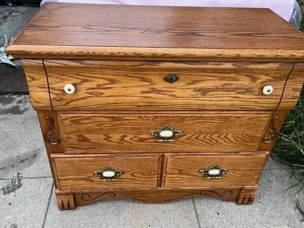 What a classy piece! Lovely small oak dresser with attractive ivory pull buttons and 3 drawers. Really cute size. 37.5 long x 32 tall x 18 deep. In excellent condition. $195.Can deliver nearby for extra fee. Mid City LA near Fairfax and Pico Streets, 90019. Contact outdoorslew at gee male or call 310-770-7962.