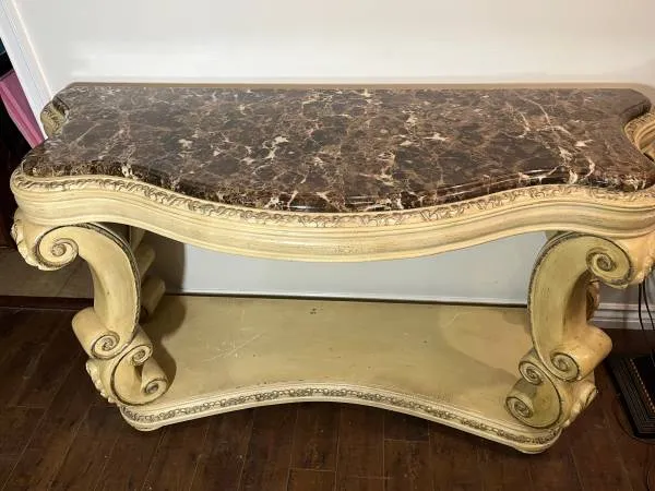 Classy console table with beautiful marble top. In lovely shape although a few cosmetic scratches on bottom. 58 long x 22 deep x 33 tall. $195. Westside LA near Fairfax and Pico Streets. Can deliver nearby for an extra fee. Contact outdoorslew at gee male or call 310-770-7962.