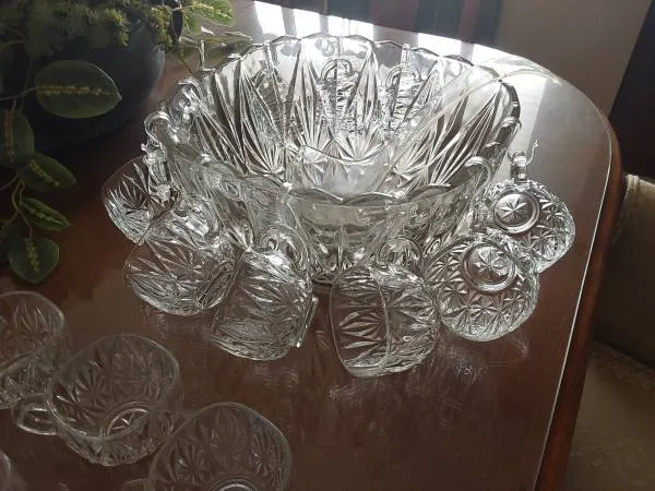 Vintage Punch Bowl Set. Please call 520-395-6692. Leave Name and Number. 1 Punch Bowl 17 Cups 10 Hooks 1 Ladle