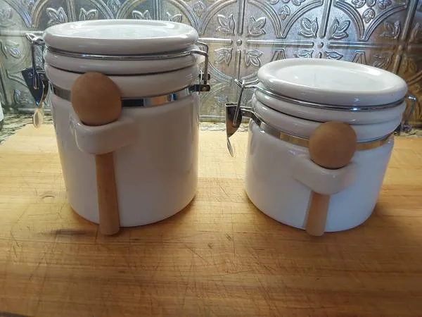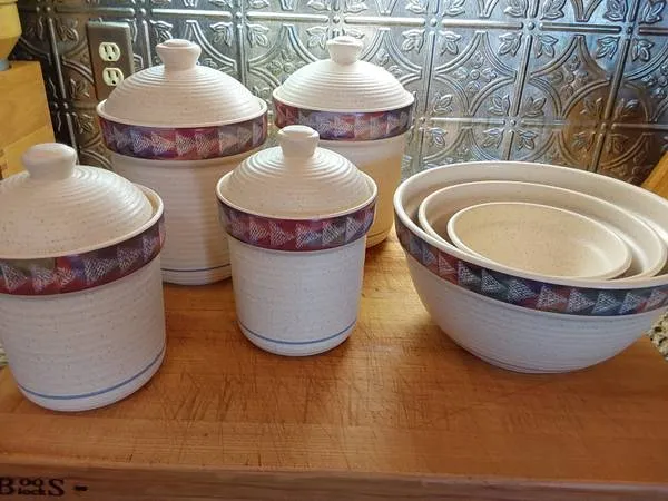 New Treasure Craft St 1 ware Set. Set of 4 Canisters with lidslg 10 sm 8 and set of 3 Matching Mixing Bowls. Lg 10 Med 8 Sm is 6. No texting. Please call 520-395-6692 Leave Name and Number.