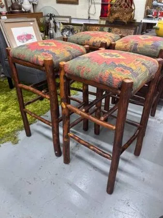 Offering 4 - Unique style rustic barstools in really good condition - as you can see, they are void of damage & priced to sell [$199.00 for set of 4 - 161/2 x 161/2 x 30 tall ?? - Bill - 785-221-2643