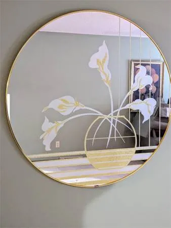 Offering a large Gloria Erickson etched glass mirror - it is in excellent condition [see pictures] - it measures 291/2 in diameter and is priced at only $89.00 - considerably cheaper than internet prices and no shipping ??? Bill - 785-221-2643