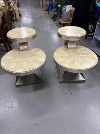 in booth 15 at Lawrence Antique Mall - ?? Bill - 785-221-2643 Offering a pair - Unique style -silver - 2 tier w/faux marble top - end tables [$179.00 for set] - they are in good condition but do show some wear - top large diameter section 24 diameter & small diameter section 161/2 diameter - are solid and very heavy - will not last long at only $179.00