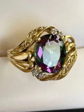 10 k - 4.3 grams. Stunning fineTopaz quality gold ring with 1 precious oval cut topaz / multi colors in the center. 4 beautiful round cut genuine diamond accents on its sides. Size 8. call: 619-569-9995.