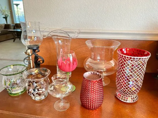 Sizes: 14.5 - 13 - 12 - 10 - 9 - 8 - 7 - 5. 9 pieces very beautiful glass decorative vases or candle holders. $30 for all in the picture. Call: 619-569-9995.