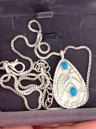 Brand new. Beautiful 925 Sterling silver square chain necklace with feather pendent 20 x 1.5 mm. The pendent teardrop - shaped with turquoise st 1 s. 1.5 long. Located Murrieta by Los Alamos rd and Hancock!.. Call: 619-569-9995.
